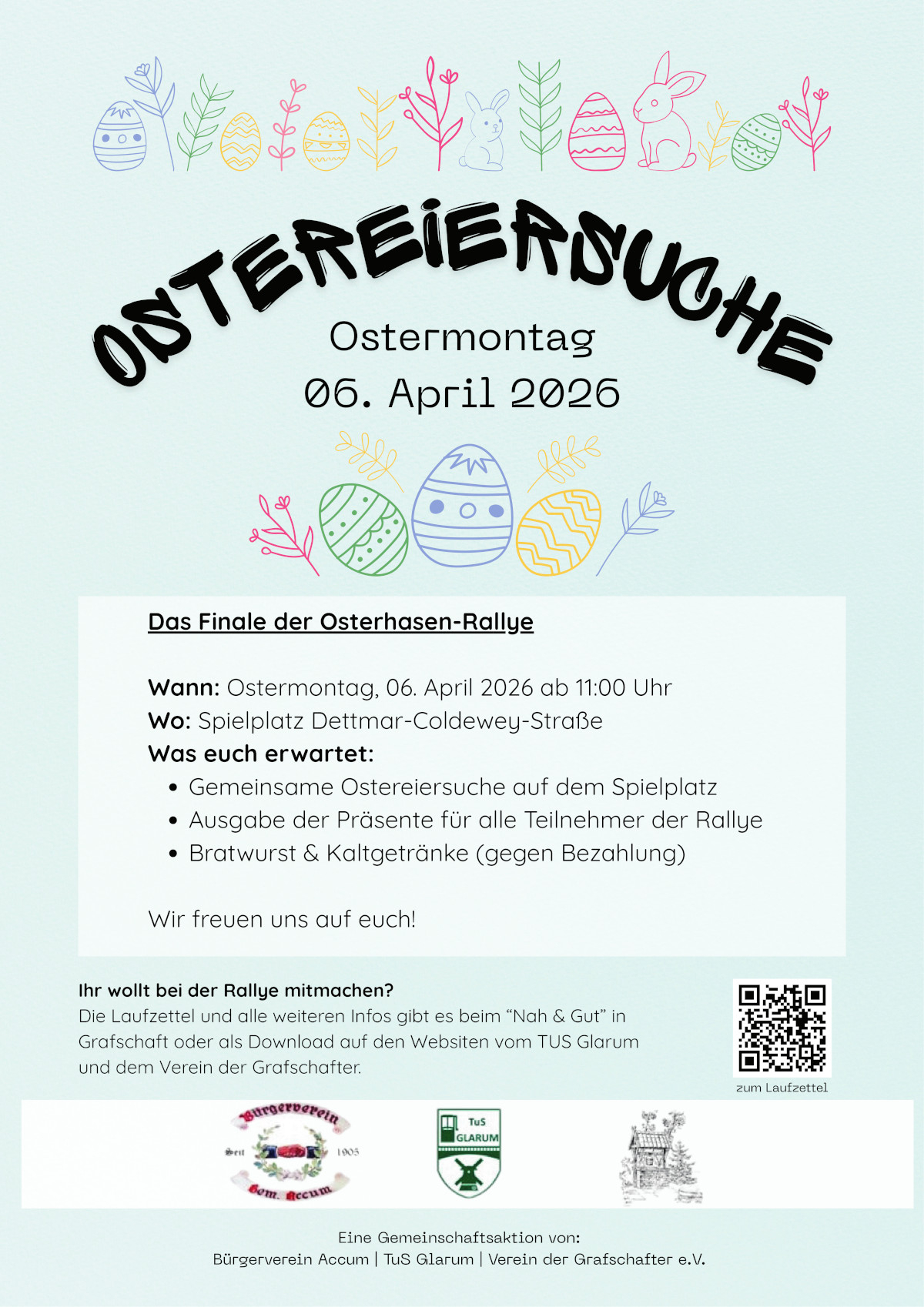 Bereits in den zwei Wochen vor Ostern verstecken sich diverse Osterhasen in Grafschaft und Accum. In einer gemeinsamen Aktion vom TuS Glarum, Bürgerverein Accum und dem Verein der Grafschafter können an verschiedenen Orten in den Stadtteilen die Osterhasen aufgesucht werden und der Laufzettel gefüllt werden. Der vollständige ausgefüllte Laufzettel kann bis 03.04.2026, 18:00 im Briefkasten der Geschäftsstelle des TuS Glarum e.V., Ammerländer Str. 17, oder an der Accumer Mühle, abgegeben werden.